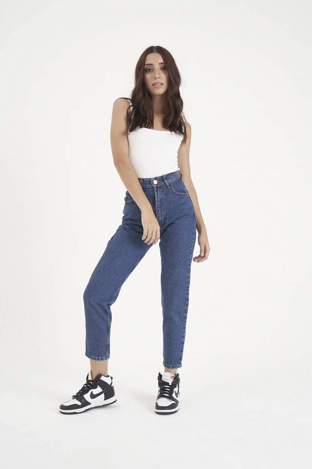 - Corte mom, cintura ajustada, cadera y rodillas con mas volúmen, se afina hacia el ruedo.